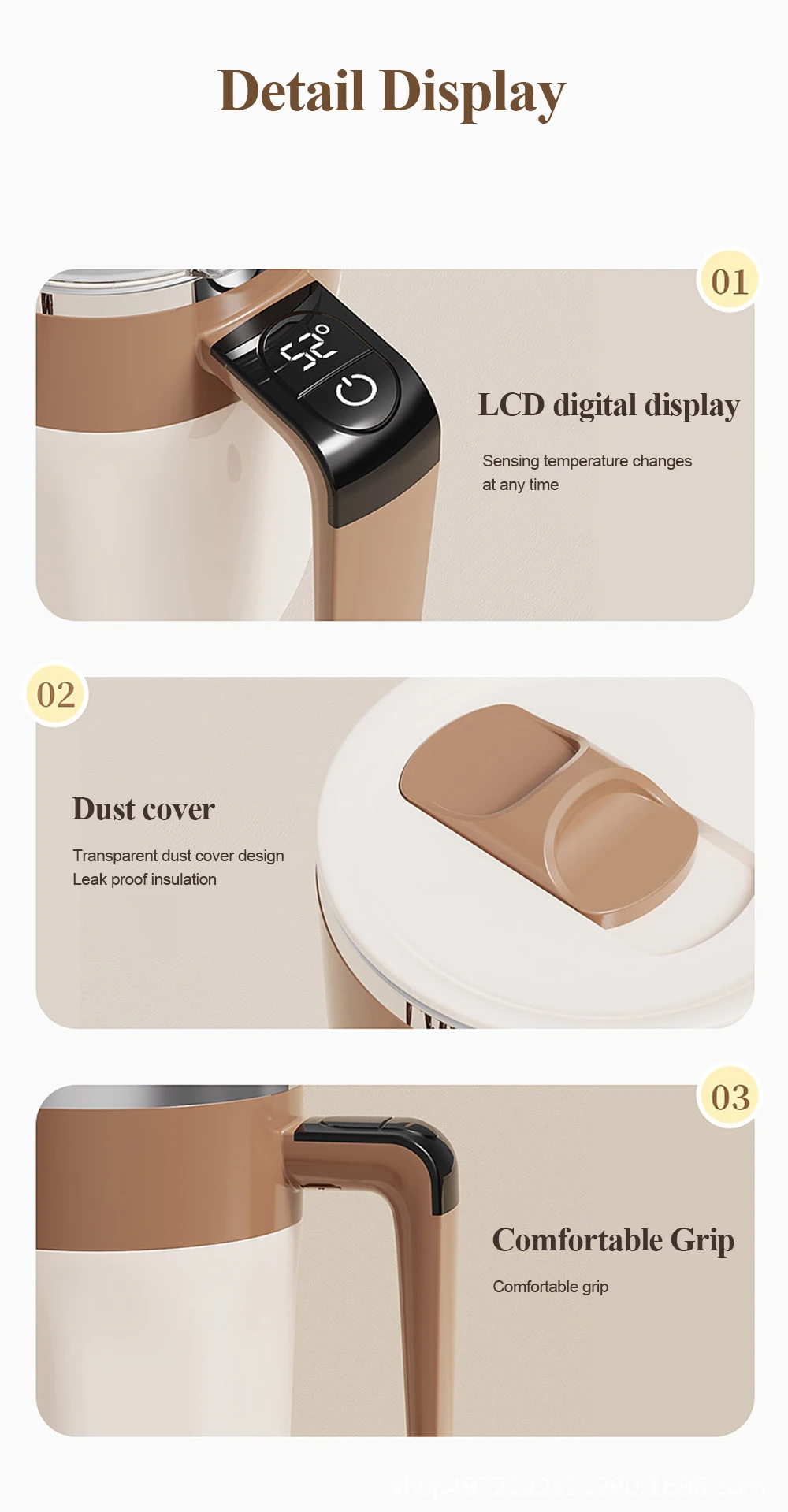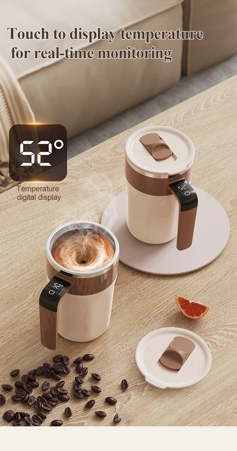 EASY TO USE: To use, simply place the magnetic bead on the bottom of the electric coffee mug, double-click the button at the handle to start stirring, and press again to stop stirring. The lid minimizes spills and the real-time temperature display feature allows you to know exactly how hot the drink is inside the rechargeable self stirring mug. This prevents mouth burns due to high temperatures.